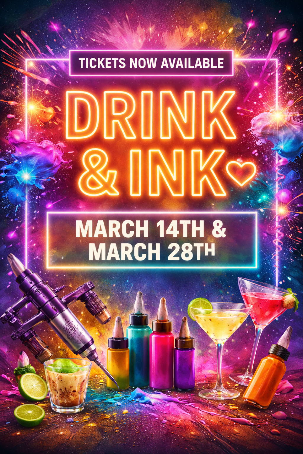 We provide all the supplies—you just bring your favorite drinks, good vibes, and get ready to ink your own masterpiece. No experience needed!