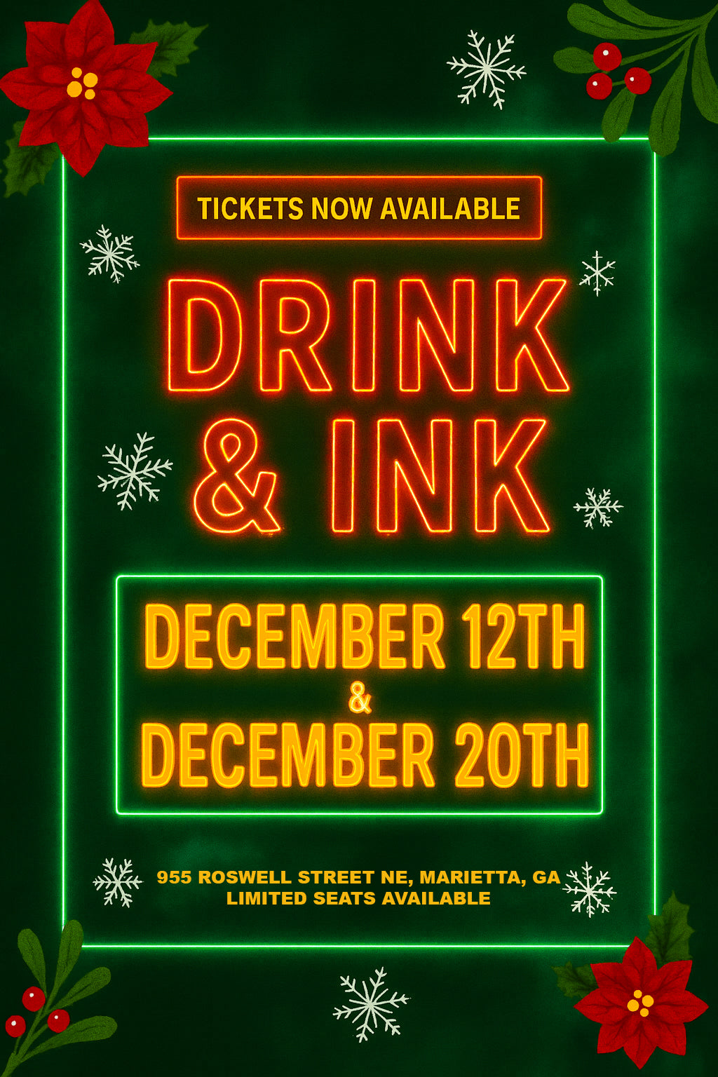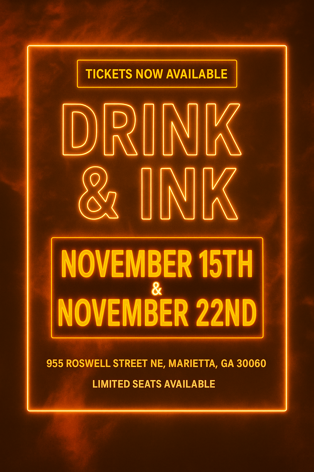 Whether you're a complete beginner or creatively curious, everyone is welcome at Drink & Ink! All materials will be provided on-site—you just bring your creativity (and your favorite drinks). Whether you're flying solo or coming with friends, get ready for a fun, laid-back night and leave with your own tattooed masterpiece on synthetic skin.
